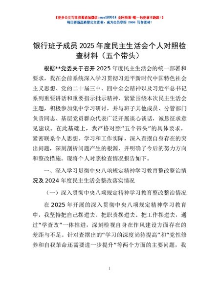 / 银行班子成员2025年度民主生活会个人对照检查材料(五个带头)
