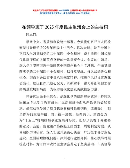 在市委政研室领导班子2025年度民主生活会上的主持词