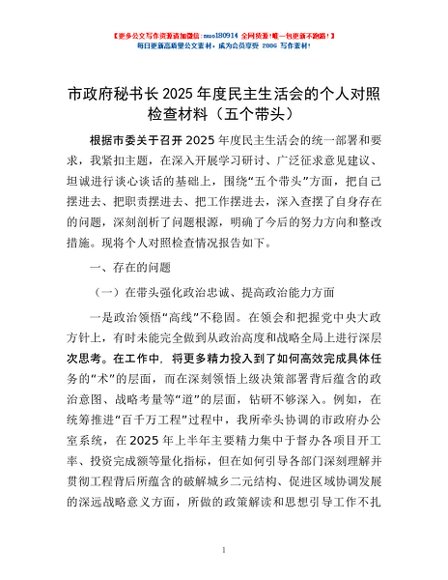 / 市政府秘书长2025年度民主生活会的个人对照检查材料(五个带头)