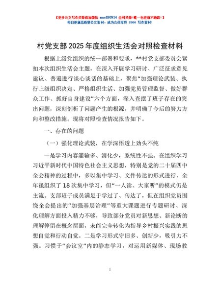 / 村党支部2025年度组织生活会对照检查材料