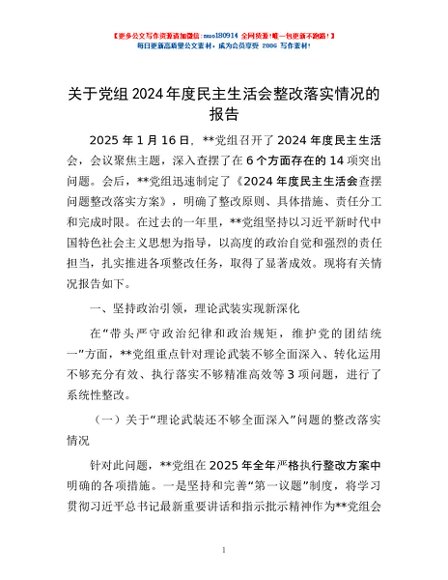 / 关于党组2024年度民主生活会整改落实情况的报告