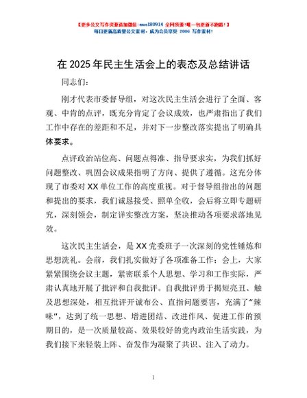 / 在2025年民主生活会上的表态及总结讲话
