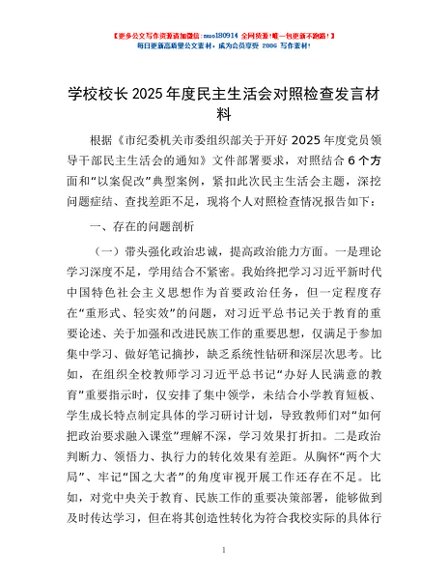 / 学校校长2025年度民主生活会对照检查发言材料