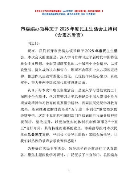 / 市委编办领导班子2025年度民主生活会主持词(含表态发言)