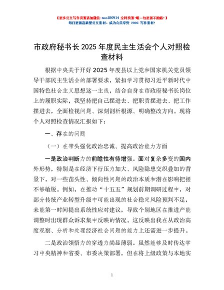 / 市政府秘书长2025年度民主生活会个人对照检查材料