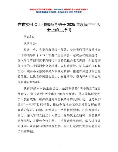 / 在市委社会工作部领导班子2025年度民主生活会上的主持词