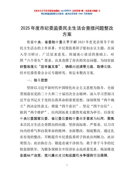 / 2025年度市纪委监委民主生活会查摆问题整改方案