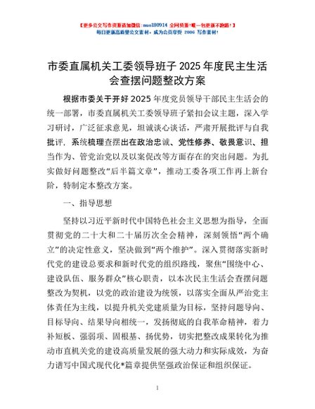 / 市委直属机关工委领导班子2025年度民主生活会查摆问题整改方案