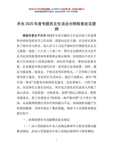 / 市长2025年度专题民主生活会对照检查发言提纲