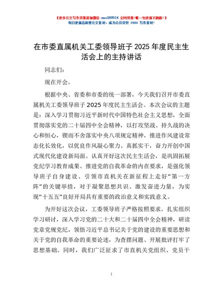 / 在市委直属机关工委领导班子2025年度民主生活会上的主持讲话