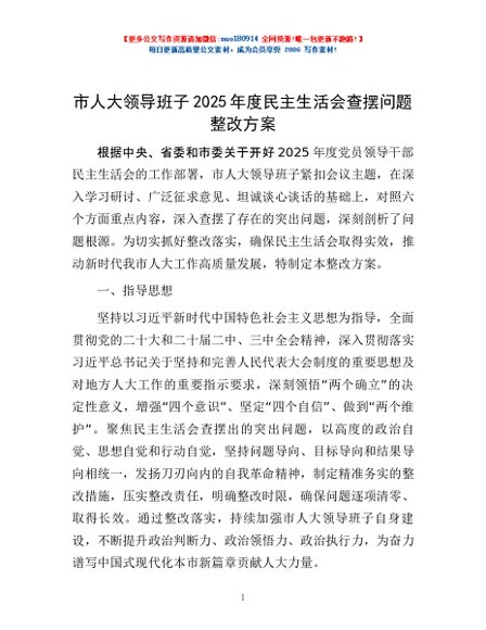 / 市人大领导班子2025年度民主生活会查摆问题整改方案