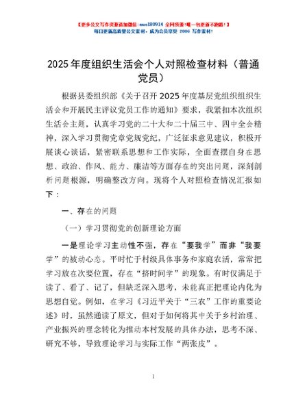/ 2025年度组织生活会个人对照检查材料(普通党员)