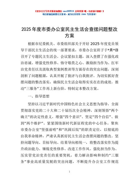 / 2025年度市委办公室民主生活会查摆问题整改方案