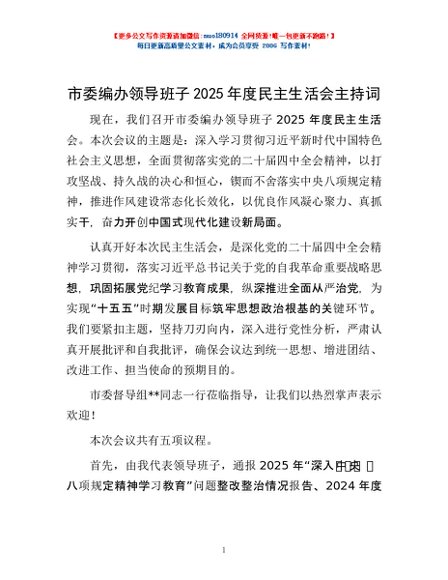 在市委政研室领导班子2025年度民主生活会上的主持词