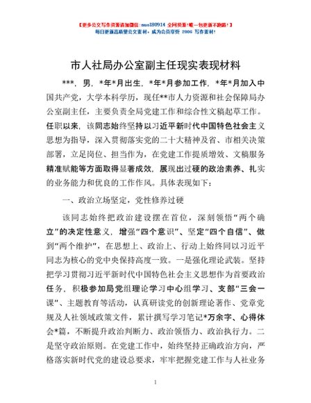 / 市人社局办公室副主任现实表现材料