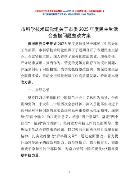 / 市科学技术局党组关于市委2025年度民主生活会查摆问题整改方案