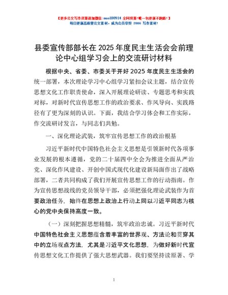 / 县委宣传部部长在2025年度民主生活会会前理论中心组学习会上的交流研讨材料