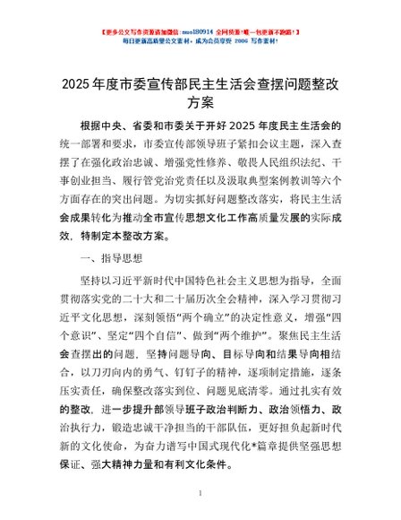 / 2025年度市委宣传部民主生活会查摆问题整改方案