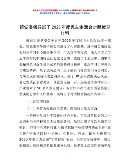 / 镇党委领导班子2025年度民主生活会对照检查材料
