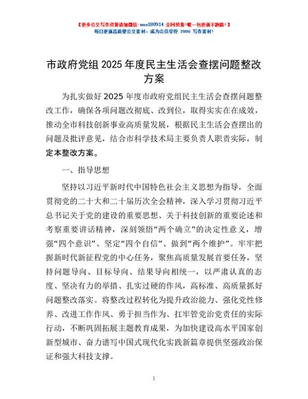 / 市政府党组2025年度民主生活会查摆问题整改方案