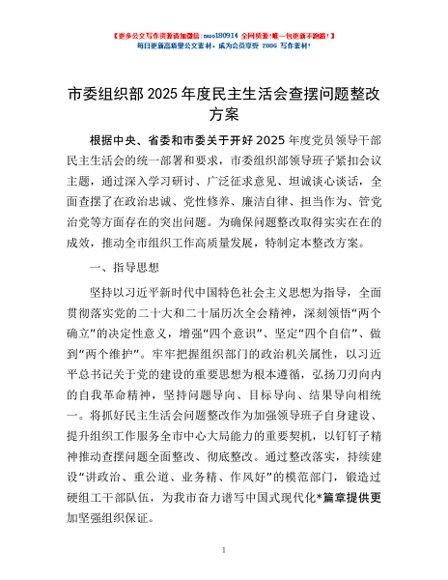 / 市委组织部2025年度民主生活会查摆问题整改方案