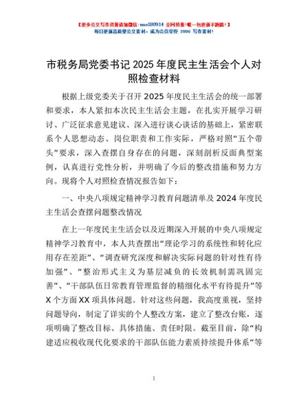 / 市税务局党委书记2025年度民主生活会个人对照检查材料