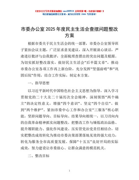 / 市委办公室2025年度民主生活会查摆问题整改方案