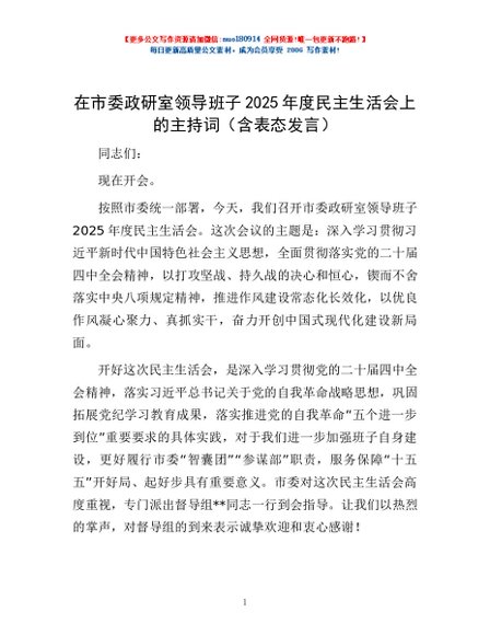 / 在市委政研室领导班子2025年度民主生活会上的主持词(含表态发言)