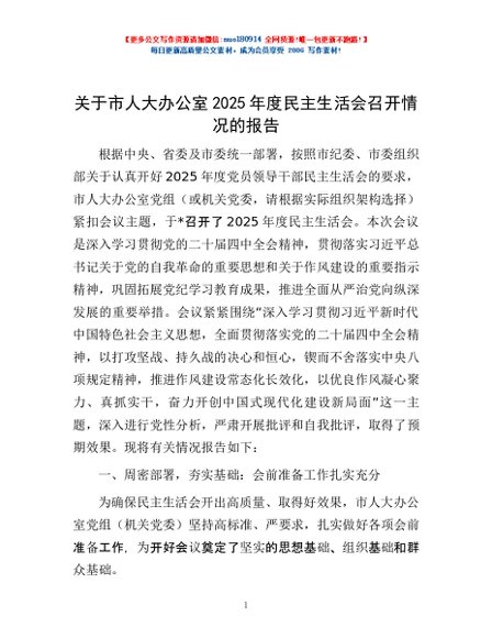 / 关于市人大办公室2025年度民主生活会召开情况的报告