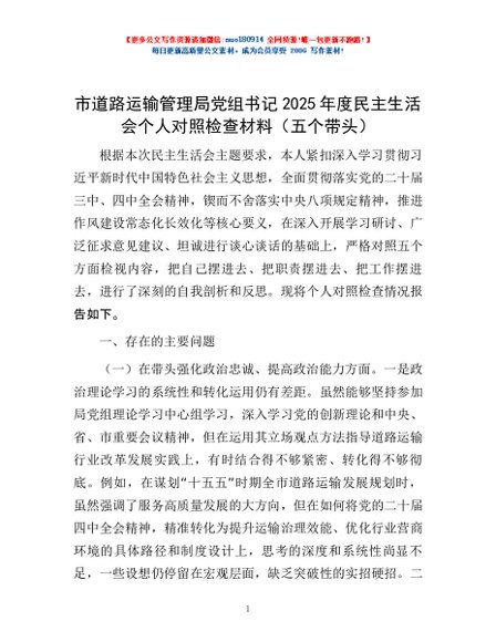 / 市道路运输管理局党组书记2025年度民主生活会个人对照检查材料(五个带头)
