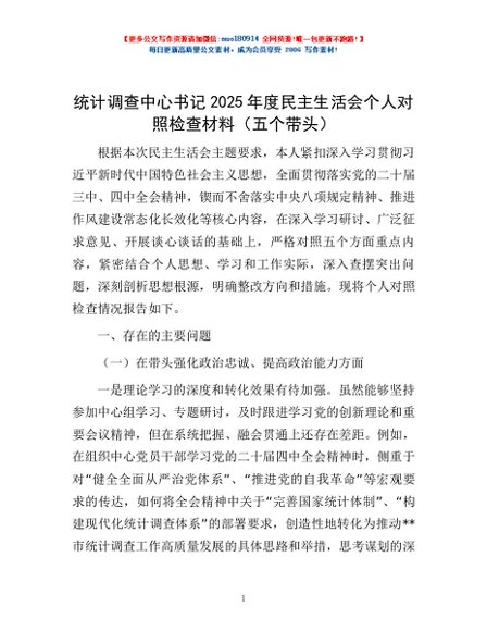 / 统计调查中心书记2025年度民主生活会个人对照检查材料(五个带头)