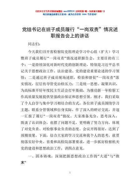 / 党组书记在班子成员履行“一岗双责”情况述职报告会上的讲话