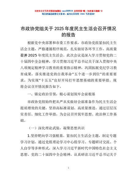 / 市政协党组关于2025年度民主生活会召开情况的报告