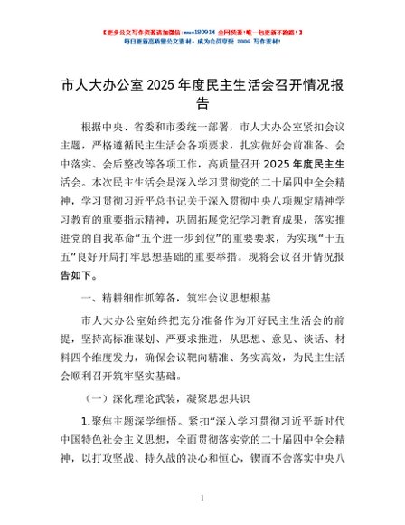 / 市人大办公室2025年度民主生活会召开情况报告