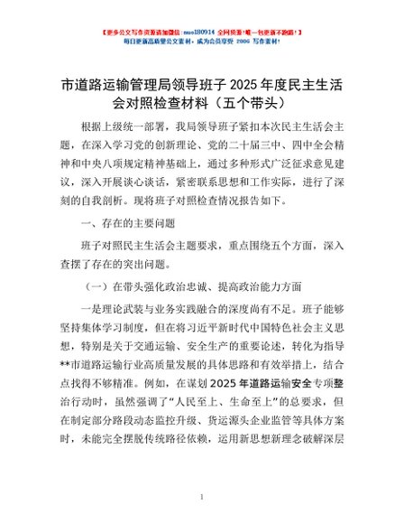 / 市道路运输管理局领导班子2025年度民主生活会对照检查材料(五个带头)