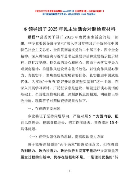 / 乡领导班子2025年民主生活会对照检查材料
