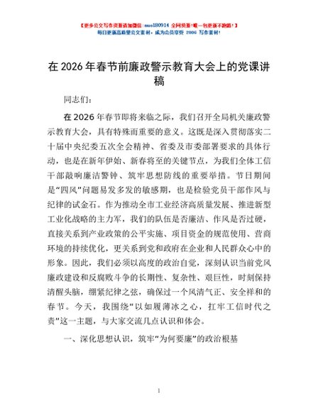 / 在2026年春节前廉政警示教育大会上的党课讲稿