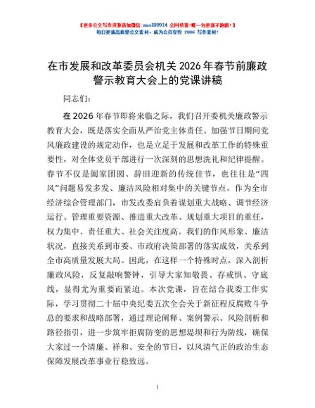 / 在市发展和改革委员会机关2026年春节前廉政警示教育大会上的党课讲稿