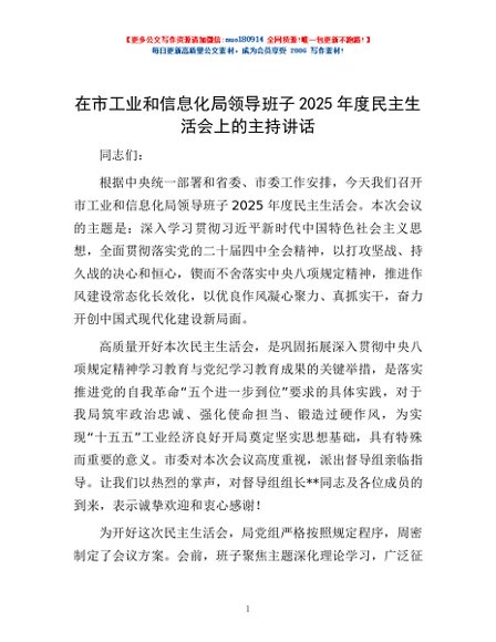 / 在市工业和信息化局领导班子2025年度民主生活会上的主持讲话