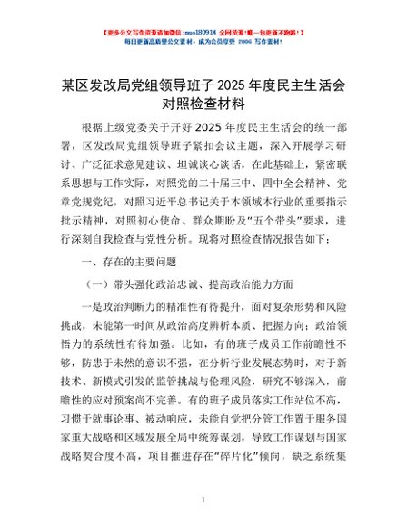 / 某区发改局党组领导班子2025年度民主生活会对照检查材料