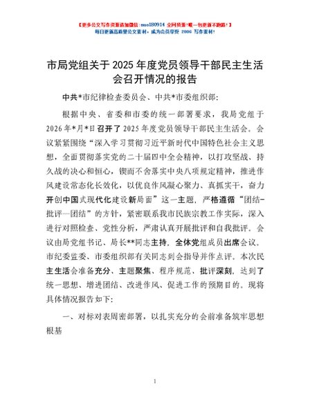 / 市局党组关于2025年度党员领导干部民主生活会召开情况的报告