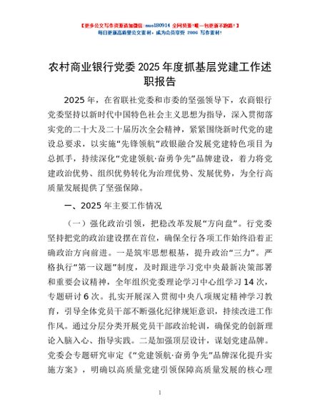 / 农村商业银行党委2025年度抓基层党建工作述职报告