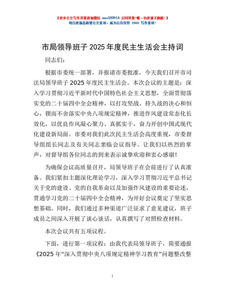/ 市局领导班子2025年度民主生活会主持词