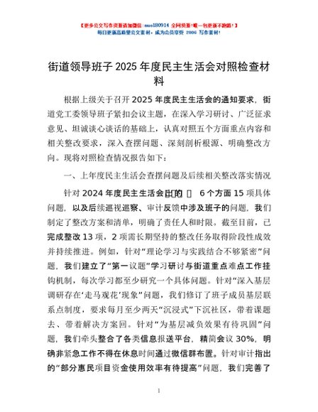 / 街道领导班子2025年度民主生活会对照检查材料