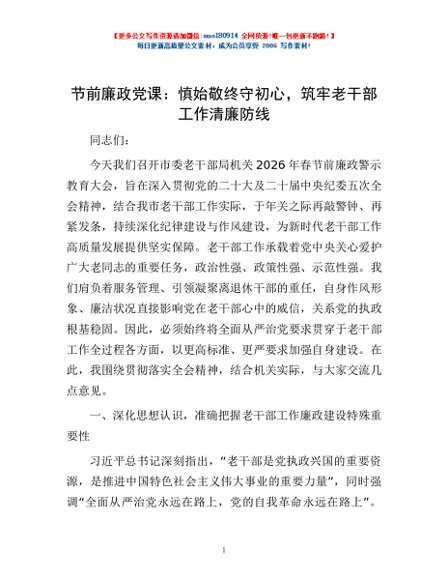 / 节前廉政党课:慎始敬终守初心,筑牢老干部工作清廉防线