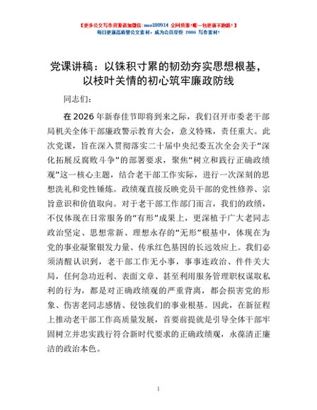 / 党课讲稿:以铢积寸累的韧劲夯实思想根基,以枝叶关情的初心筑牢廉政防线
