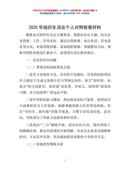 / 2025年组织生活会个人对照检查材料