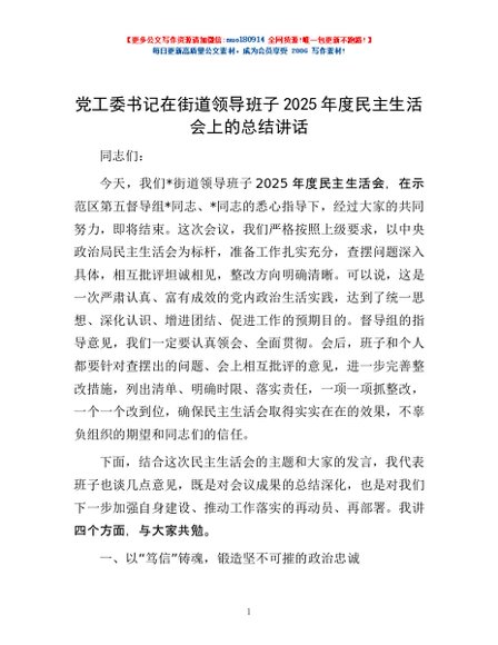 / 党工委书记在街道领导班子 2025 年度民主生活会上的总结讲话