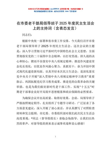 / 在市委老干部局领导班子2025年度民主生活会上的主持词(含表态发言)