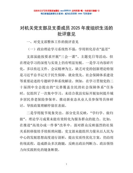 / 对机关党支部及支委成员2025年度组织生活的批评意见